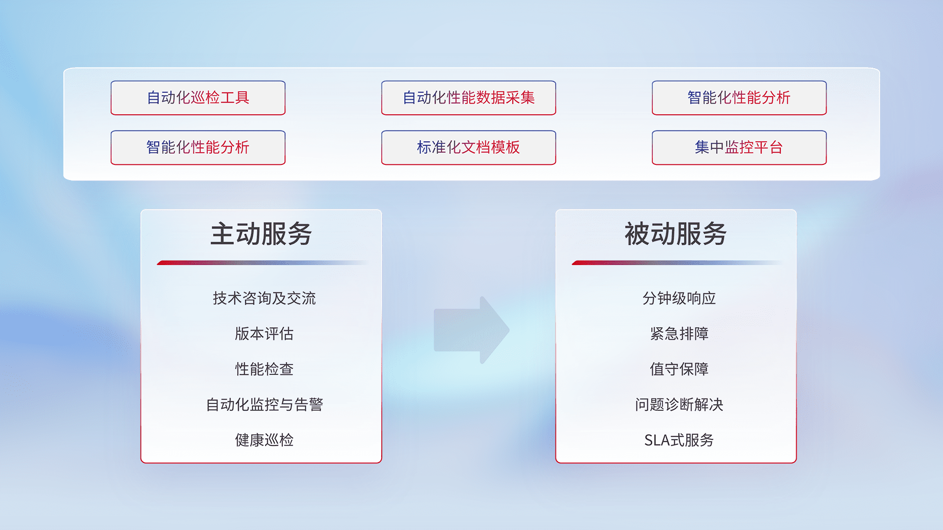 智能化工具和标准化文档,,保障服务质量,,,,提供主动服务(包含技术咨询、、、、版本评估、、、性能检查、、自动化监控与告警、、健康巡检)和被动服务包含(分钟级响应、、、紧急排障、、、值守保障、、问题诊断解决、、SLA服务)。。