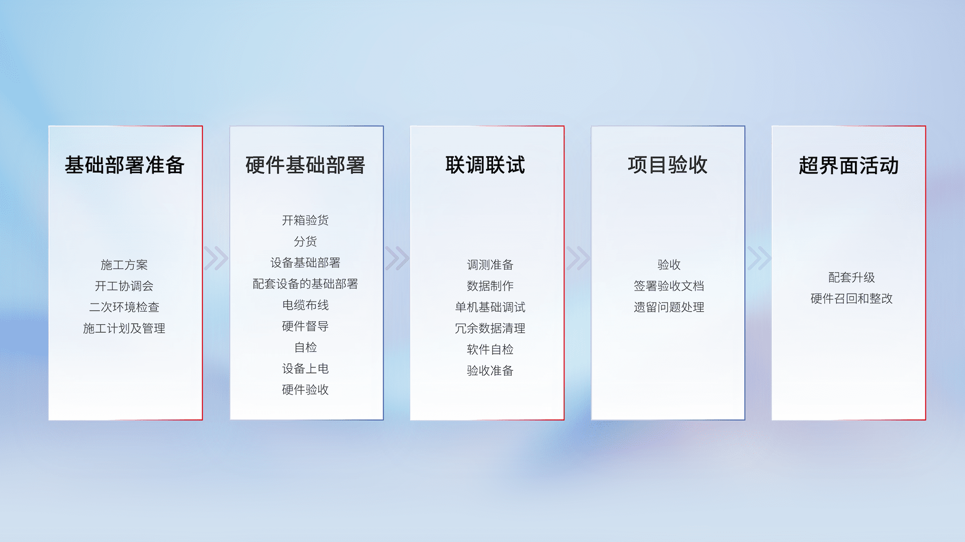 从基础部署准备、、、硬件基础部署、、联调联试、、、、项目验收、、越界面活动的全过程可追溯,,保证施工质量和进度。。