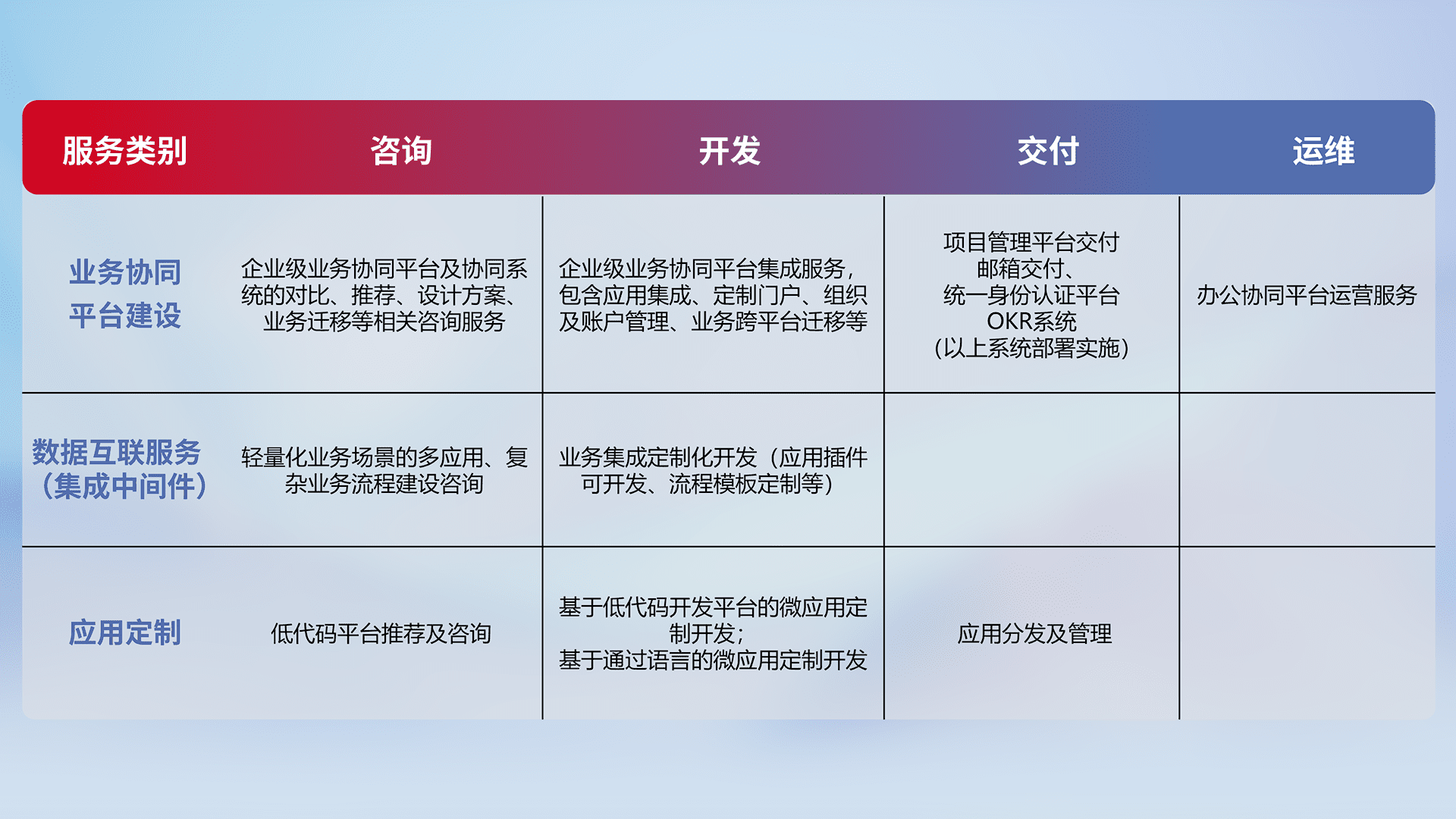 针对钉钉、、企微、、、、IDaas等平台级产品提供产品的规划、、、、方案、、、、交付、、、、定制化开发等服务,,,实现如统一协同办公、、、、智能客户服务、、混合会议管理、、、、智能数据查询、、、、等业务场景,,,,实现数字化转型。。。